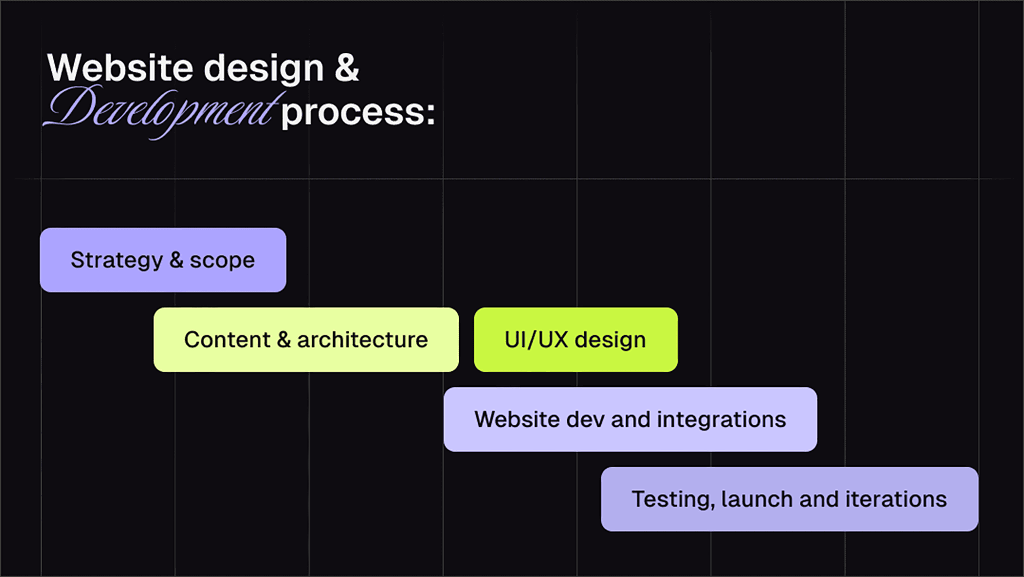 A solid website process follows 5 core steps: 1. Strategy & scope → 2. Content & architecture → 3. UX/UI design → 4. Development & integrations → 5. Testing, launch, iteration.